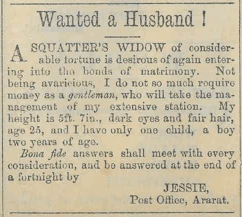 “Wanted a Husband—A young lady of prepossessing appearance, and great expectations at the death of relatives, is desirous of being married; but as she is much secluded, and has had none of the opportunities young ladies so much desire, she is compelled to advertise. Bona fide answers: will meet with every consideration from INEZ, P.O., Maryborough.”’