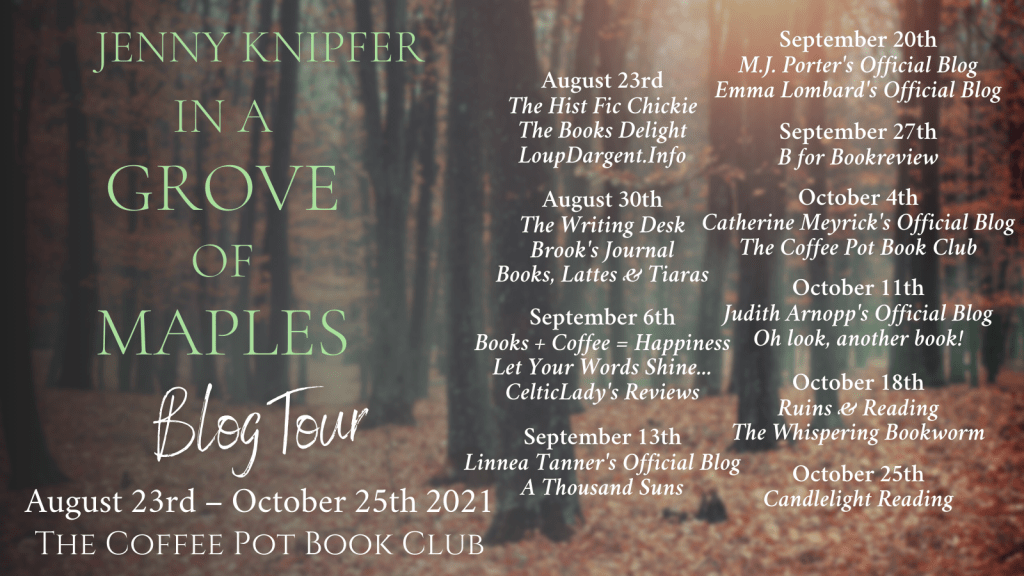 Today I’m delighted to be sharing an excerpt from Jenny Knipfer’s new novel In a Grove of Maples as part of a blog tour hosted by The Coffee Pot Book Club. In a Grove of Maples is the first book in the Sheltering Trees series.