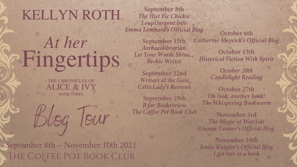 Today I’m delighted to be sharing an excerpt from Kellyn Roth’s new novel At her Fingertips as part of a blog tour hosted by The Coffee Pot Book Club. At her Fingertips is the third book in Kellyn’s series The Chronicles of Alice and Ivy.