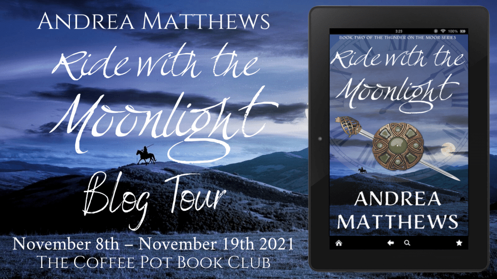 Today I’m delighted to be sharing an excerpt from Andrea Matthews’ novel Ride with the Moonlight as part of a blog tour hosted by The Coffee Pot Book Club. Ride with the Moonlight is the second book in the Thunder on the Moor time-travel series set on the Scottish borders in the 16th century.