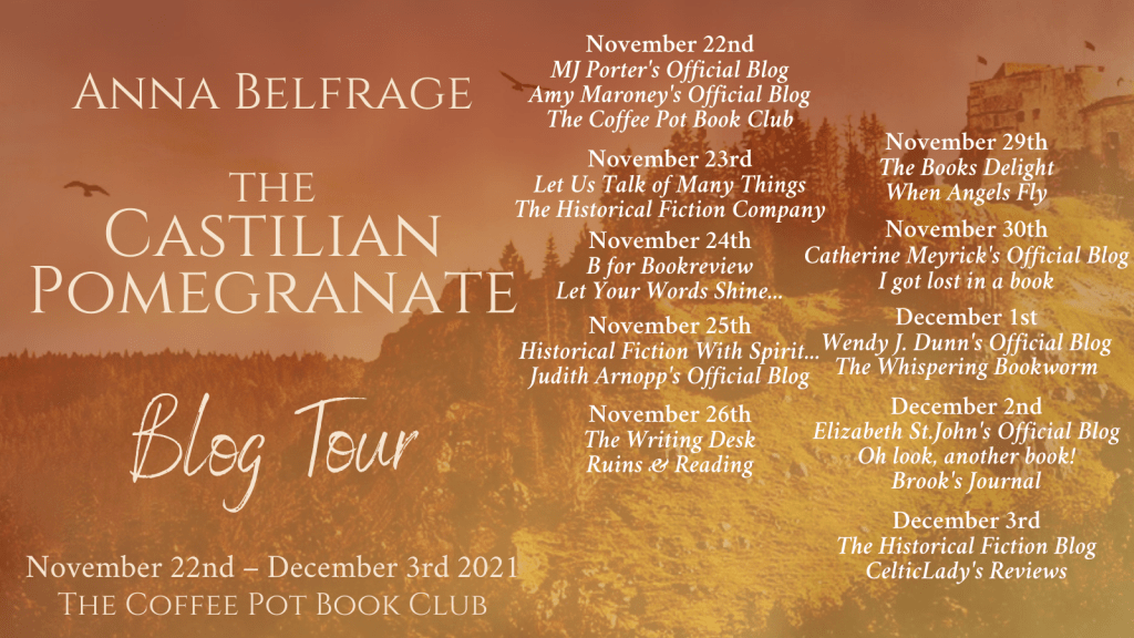 Today I’m delighted to be sharing an excerpt from Anna Belfrage’s newly released novel The Castilian Pomegranate as part of a blog tour hosted by The Coffee Pot Book Club. The Castilian Pomegranate, set in the complex political world of medieval Spain, is the second book in The Castilian Saga.