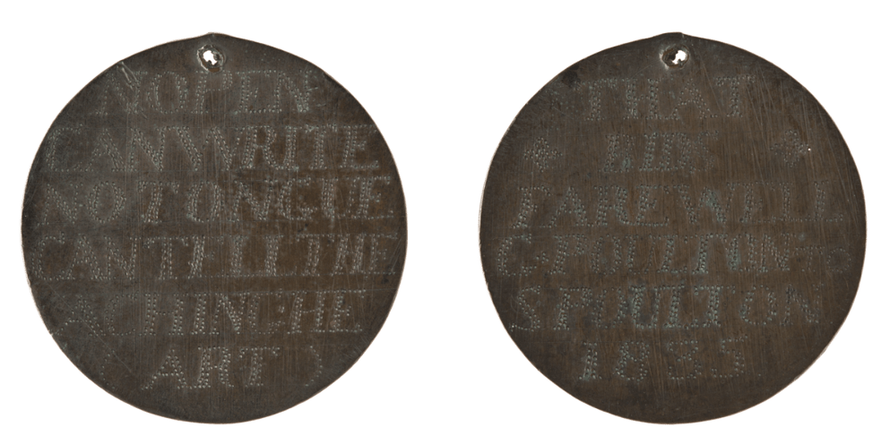 In the period between conviction and departure, within prisons or on the hulks floating in the Thames, some convicts made tokens which were passed on to those they wished to be remembered by. Called love tokens or, poignantly, leaden hearts, these tokens were handmade either by the convict himself or by ‘professionals’, other convicts with skills in silversmithing or metalwork. The tokens were usually defaced coins – pennies flattened and stippled, by tapping a nail into the surface of the coin, or skillfully engraved. Some had holes pierced at the top so they could be threaded with cord and worn around the neck. Their creation, the defacing of coinage, was an illegal act in itself.