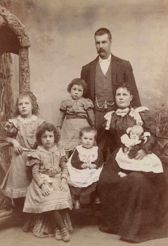 Stoicism rather than absolute boredom seems to be the attitude here in everyone except the younger children. The piping and braid on the clothing, particularly of the youngest children, indicates that these are probably their best clothes worn mainly for going to church, or for having their photograph taken. The little girls’ dresses are not quite identical but seem to be made from the same cloth and decorated in a similar way.
