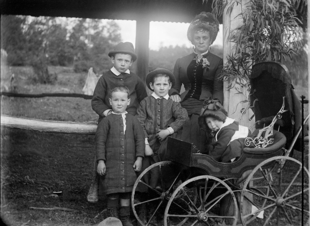The photographer, Walter Hodgkison, took photographs throughout country Victoria and New South Wales—scenes of the countryside as well as portraits in less formal settings. The boy on the front left appears to be unbreeched. It was quite common to dress little boys in skirts up until the 1920s, possibly to assist with the mechanics of toileting small children. However, many mothers did put their boys in trousers (breeches) much earlier. In view of the pretty bonnet, I would assume the child in the pram is a girl.