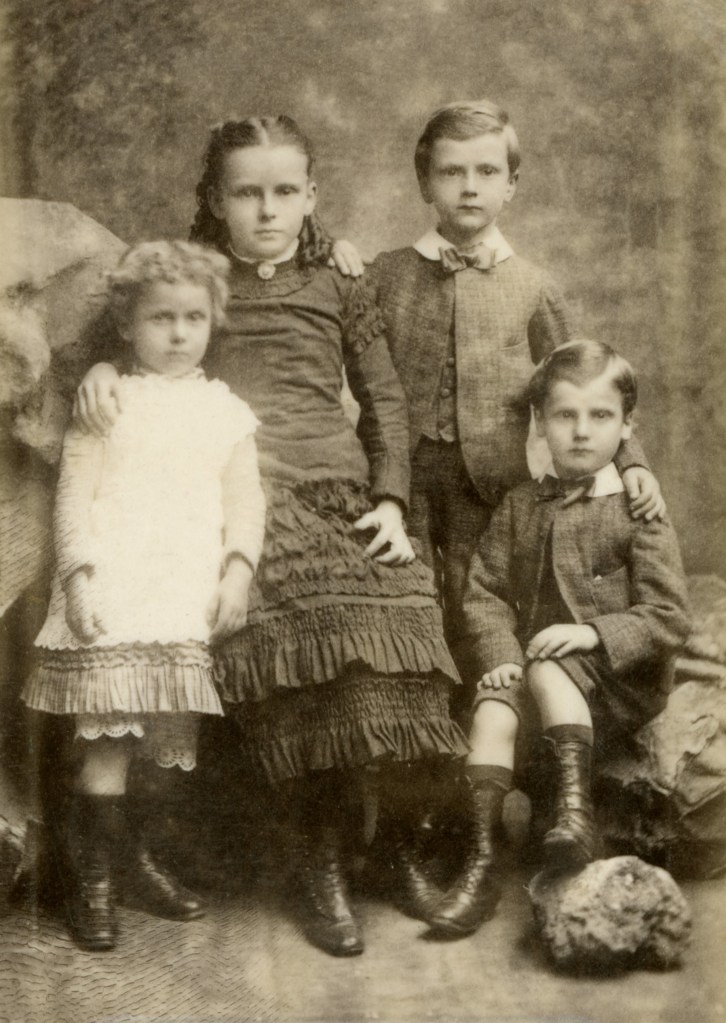 Both of these are studio portraits, complete with props. Both groups of siblings are clearly from reasonably well-off families. The eldest of the young women is wearing sizeable earrings, a ring or rings, and a brooch and necklace. The clothing of the younger children is of a finer quality than those worn in the photograph below. This particularly noticeable in the boys suits, possibly tailor-made, not run up at home.