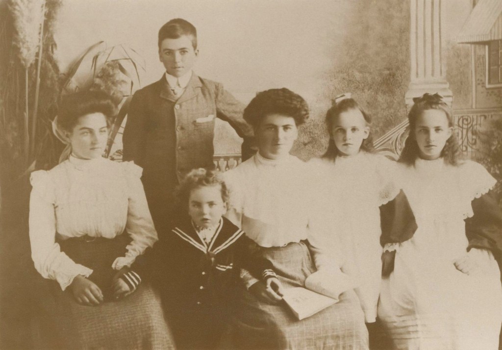 Taken about 1905 (photographer unknown), these are six of the eight children of Sarah Ann Watson (1861-1939) and William O’Connor (1847-1922) of Valencia Creek, Victoria. The young woman on the left is my grandmother, Catherine O’Connor (1889-1973), aged about sixteen.