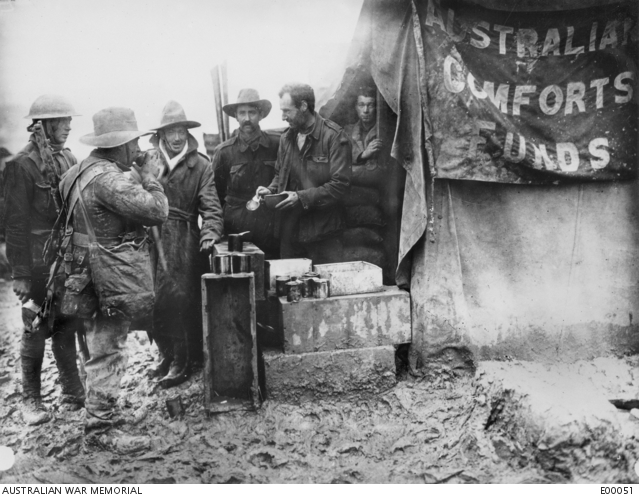 Just as we were emerging from Delville Wood, we saw, on the left of the track, a newly erected shanty with ‘Australian Comforts Fund’ painted on a linen sheet. It was surrounded by Diggers who had removed their saturated equipment, while the fellows in charge were dispensing steaming hot cocoa in old jam tins, with the lids bent back as handles … This Comforts Fund stall remained in Delville Wood, under shell fire, during the whole of the winter, and supplied a hot drink to every man who passed through the Wood (either way) during the long nights; probably more than a thousand cups were provided nightly. The value of this stall to the Diggers throughout the 1916 winter cannot be over-estimated.20