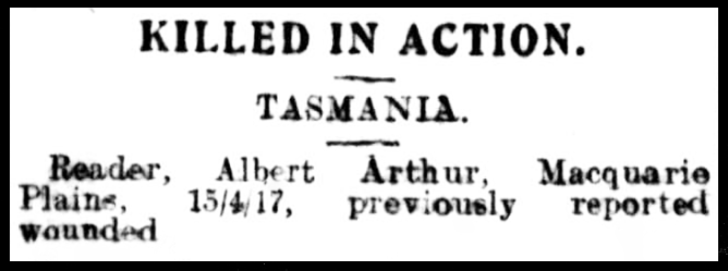 Albert was his christian name. He was a S./B. [Stretcher-bearer]. I did not know him personally. Pte. James of A Co. (now undergoing a sentence of 12 months) told me he saw Reader shot in the stomach on Easter Sunday morning at Boursies, while stretcher bearing. They had to leave him. S/B McIntyre of A Co. (now with the battn.) would know more particulars. He was stretcher bearing with Reader at the same time.31