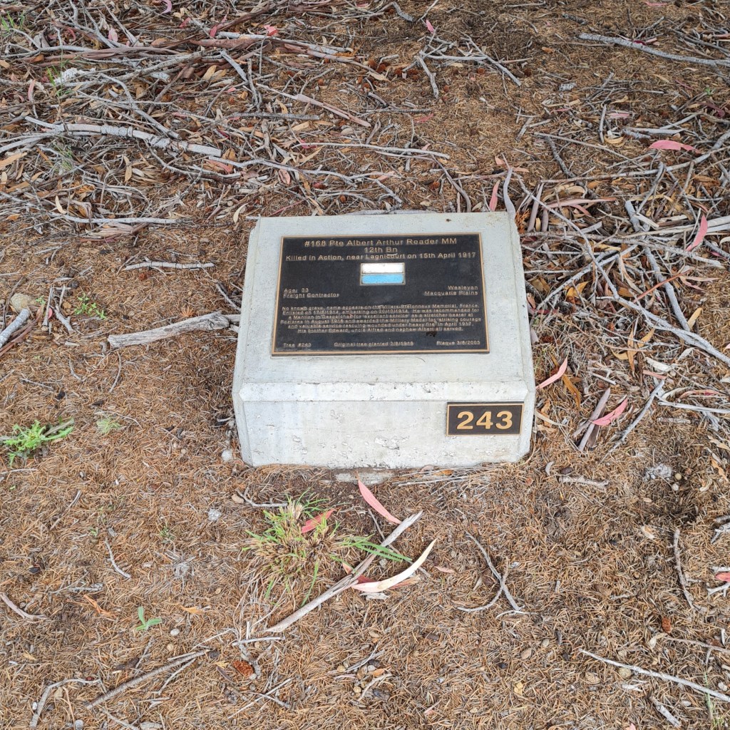 Albert’s tree is Number 243, well up the hill, towards the Powder Magazine. Standing in front of it you can glimpse the Derwent River which makes its way down from Lake St Clair and winds past Macquarie Plains and through New Norfolk and out past Hobart into the bay.
