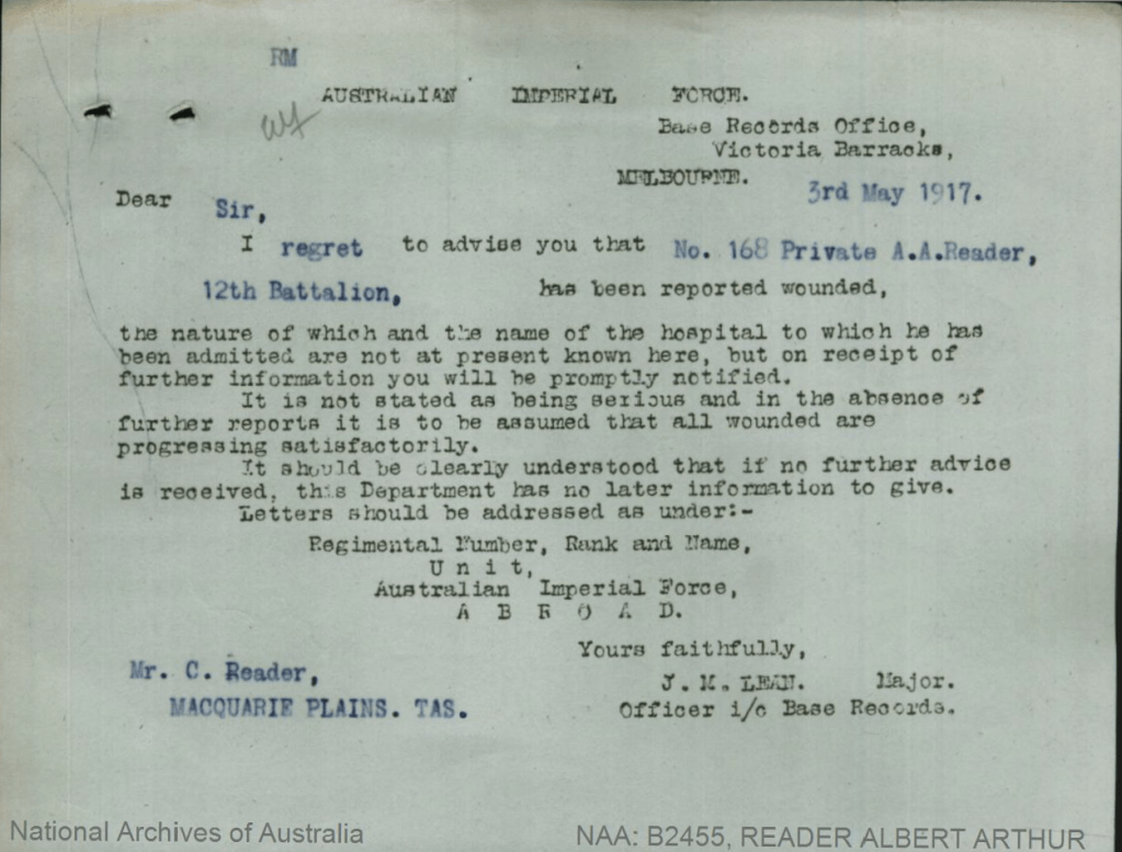 Reader was killed about that date [15 April 1917] at Bullecourt. I did not see it but was told by Pte Burrows of 12th now gone to Australia that he, Burrows, was wounded by the same shell. I heard nothing about his burial.