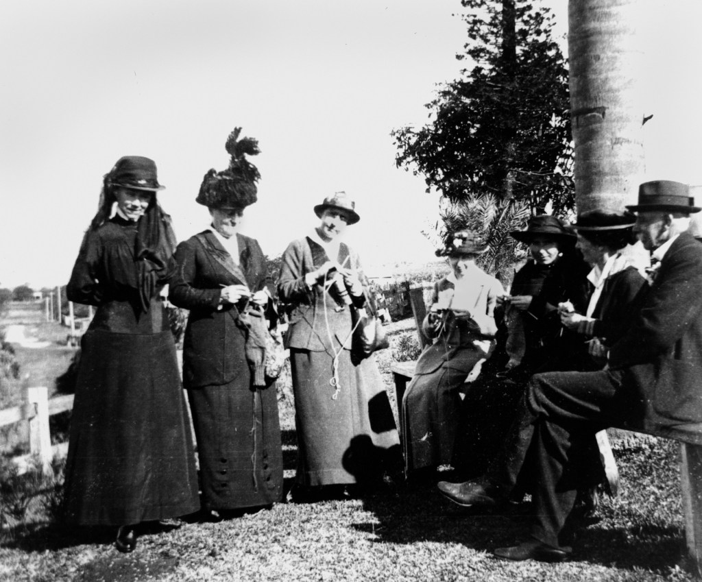 Women from the Campbell family knitting on an excursion to Redland Bay, 1916