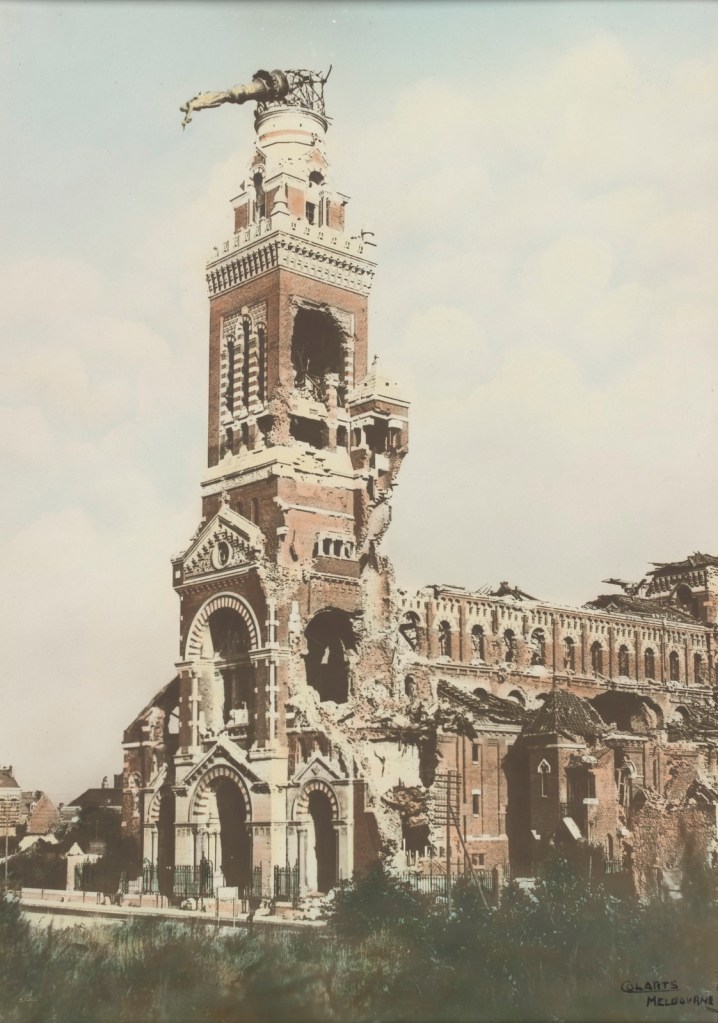 They left Naours and on 19 July reached Albert, a city that had been heavily shelled. As they marched through the city, they passed the damaged cathedral with its precariously leaning a statue of the Madonna and Child. It had been hit early in the war and leant precariously downwards from its base; however, the base had been secured in position by French Engineers.7